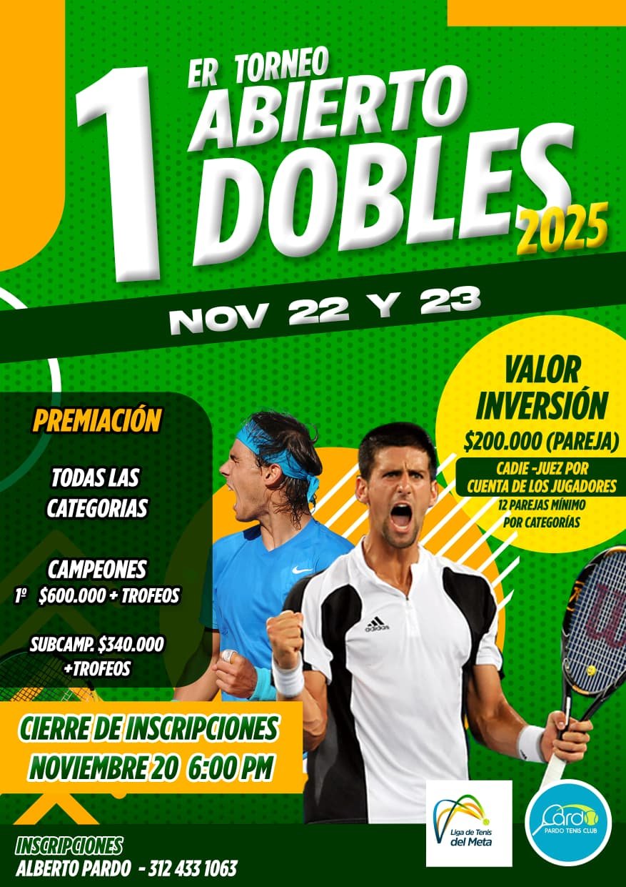 Parque Sikuani Parque La Llanura, Av. Circunvalar Carrera 19, villavicencio🏆 1ER TORNEO ABIERTO DOBLES 2025: ¡La Competencia Vuelve a Meta! 🎾 Prepara tu raqueta y a tu pareja, porque la Liga de Tenis del Meta y el Caro…